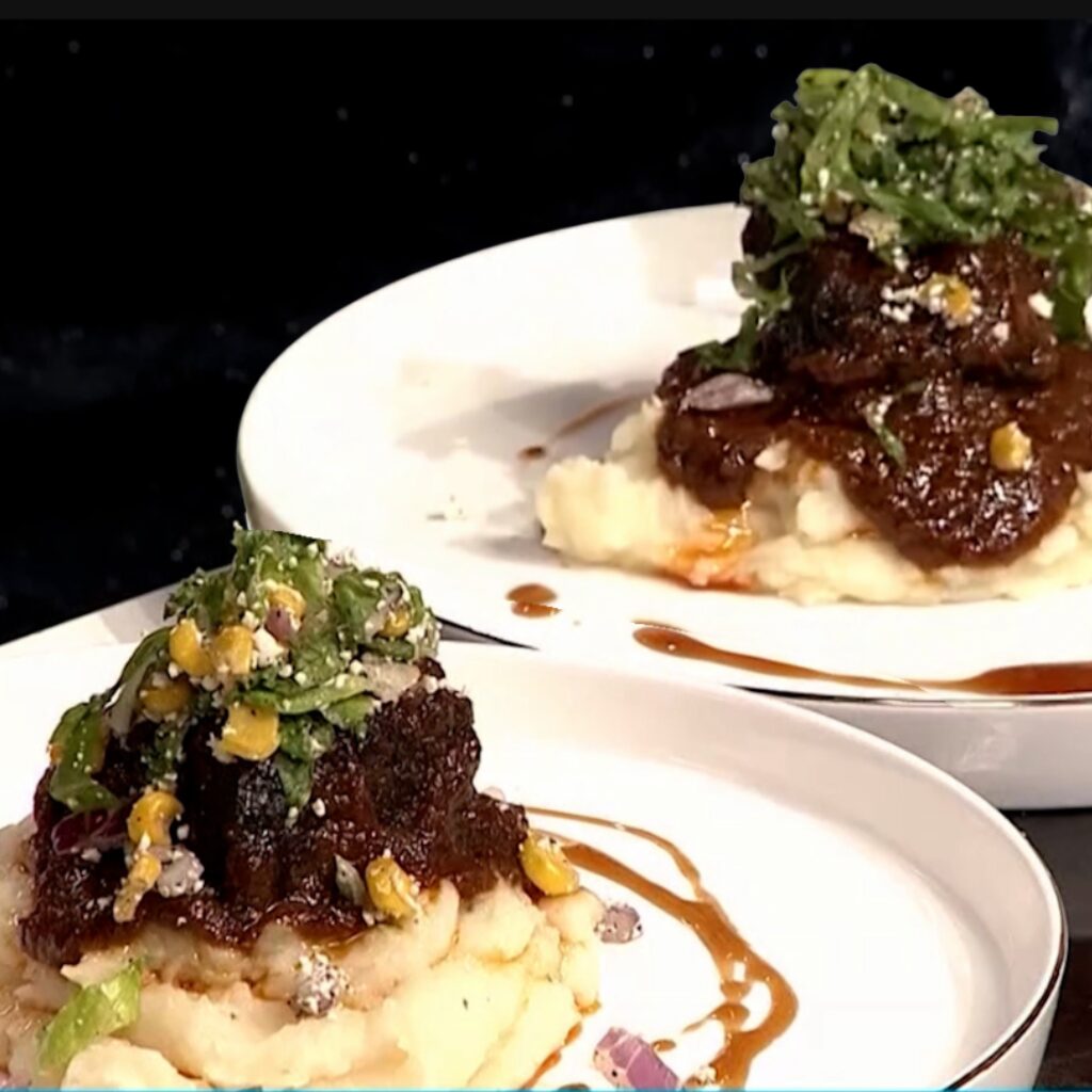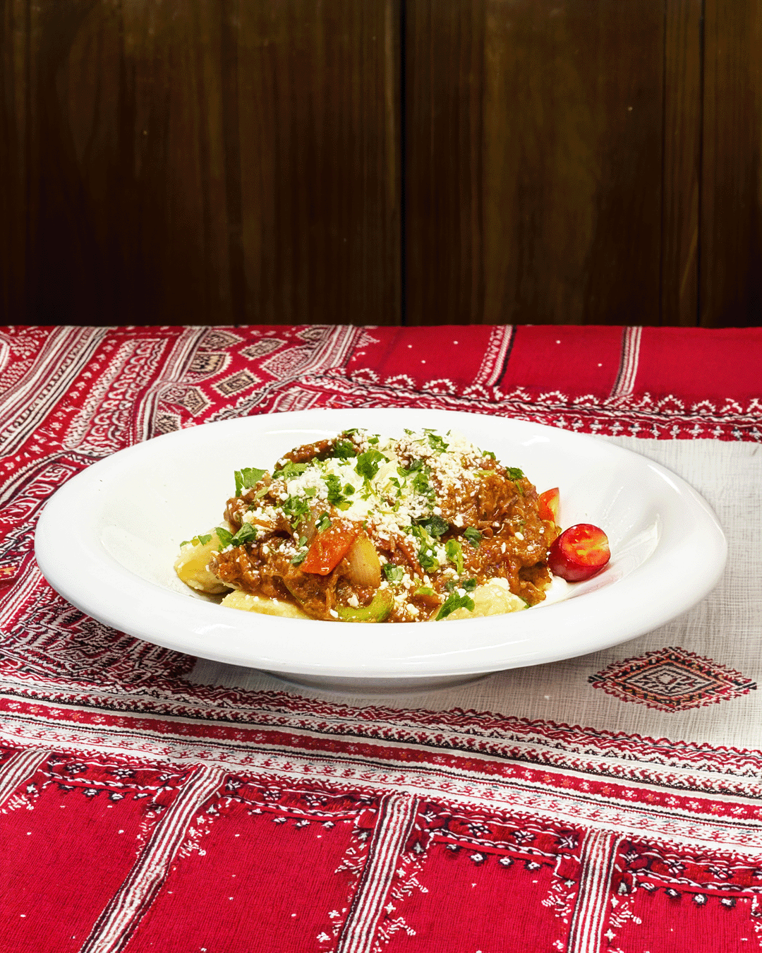 Fluffy sweet plantain gnocchi in an Italian-meets-Latin ragu-style sauce, served with your choice of beef, chicken, or vegan chorizo ragu. Vegetarian (not vegan).